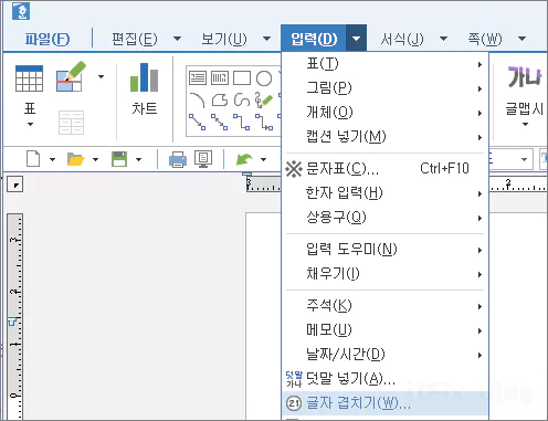 원형 문자를 넣을 자리에 커서가 위치한 상태에서 상단 메뉴의 '입력 > 글자 겹치기'를 클릭합니다.