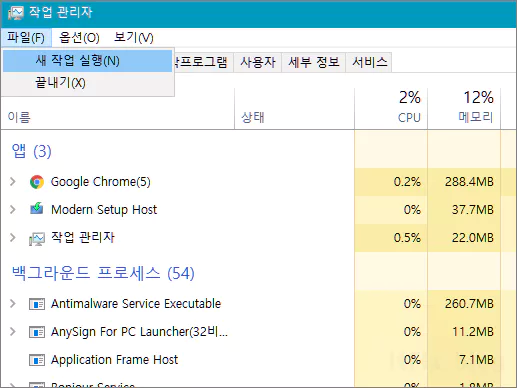 작업 관리자가 실행되면 상단 메뉴의 파일 > 새 작업 실행을 클릭합니다.