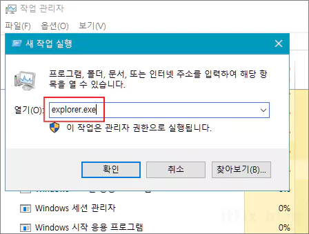 명령 창에 explorer.exe를 타이핑한 다음 확인을 눌러 줍니다.