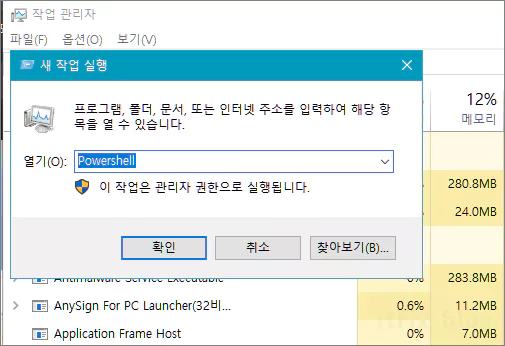 팝업 창에 PowerShell이라고 타이핑한 다음 확인 버튼을 눌러 줍니다.