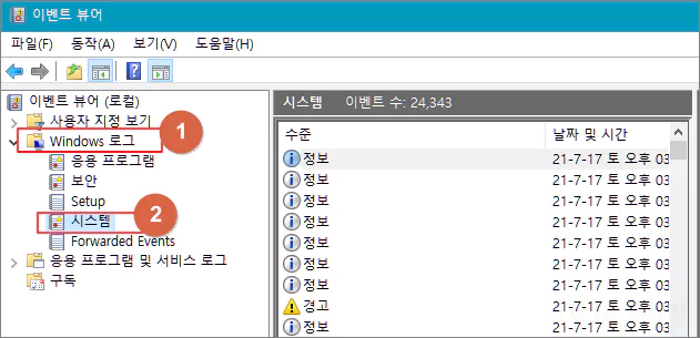 이벤트 뷰어에서 시스템이 작동한 로그 기록 정보는 기본적으로 시간순으로 정렬되어 있으므로 비교적 오류 기록을 찾기 쉬운 편입니다.