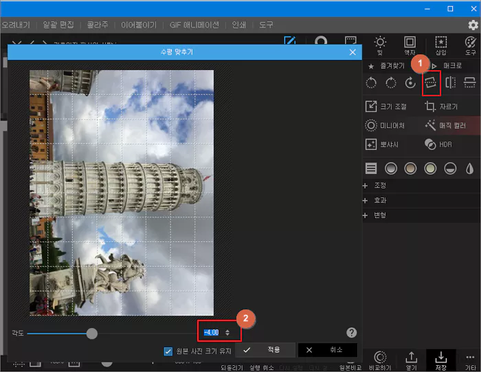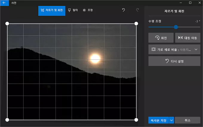 편집을 클릭한 다음 수평 맞추기 슬라이드 바를 좌우로 클릭하면 이미지에 자동으로 눈금이 형성되므로 미리 보기를 하면서 기울기의 정도를 조정할 수 있습니다. 비록, 기능이 다소 약하다고 볼 수는 있지만 직관적으로 빠르게 조절해야 할 경우에는 꽤나 유용합니다.