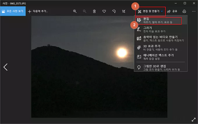 수평을 맞춰야 하는 이미지를 사진에서 불러온 다음 상단 메뉴의 편집 및 만들기를 클릭한 다음 편집을 누릅니다.