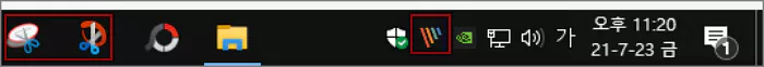 현재 PC를 켜면 작업 표시줄의 구성은 아래의 이미지와 같은 모습이 됩니다. 알람 영역으로 메인 캡처 프로그램인 픽픽이 들어가게 되고 윈도우의 캡처 도구들은 보조 캡처 프로그램으로 사용하기 위해 작업 표시줄에 등록해 둔 상태입니다.