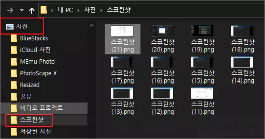 픽픽에서 단축키를 조정하면서 전체화면 캡처하기를 Shift+PrtScr로 변경해 두었지만, 이 단축키를 굳이 사용하지 않고 윈도우 시스템 고유의 단축키인 윈도우 로고 키+PrtScr 키를 누르면 사진 폴더 아래에 있는 스크린샷 폴더 내에 자동으로 저장되므로 이 폴더에서 꺼내서 쓰기도 합니다.