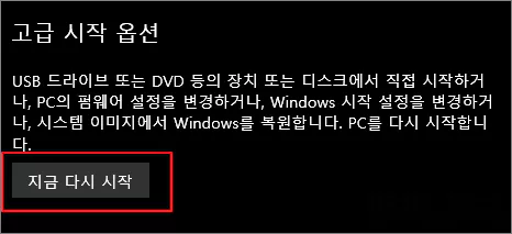 윈도우 설정 > 업데이트 및 보안 > 복구로 들어간 다음 우측 항목에서 고급 시작 옵션에 있는 '지금 다시 시작' 버튼을 눌러 줍니다.