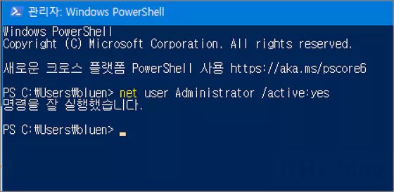 파워셀 창이 뜨면 파워셀 창에 다음과 같이 입력한 다음 엔터키를 칩니다. 복사하여 붙여 넣기 해도 동일한 효과가 있습니다.