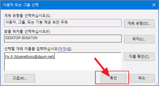 고급 버튼을 클릭하면 사용자 또는 그룹 선택 화면이 나타나게 되는 데, 지금 찾기 버튼을 눌러 뜨는 목록 중 현재 윈도우에 로그인하는 자신의 이메일이 있는 메인 계정 이름이 있는 사용자를 선택한 다음 확인 버튼을 누릅니다.