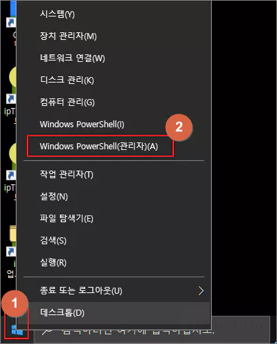윈도우 작업 표시줄의 시작 로고를 마우스 우클릭한 다음 Windows PowerShell(관리자)를 클릭하여 실행시킵니다.