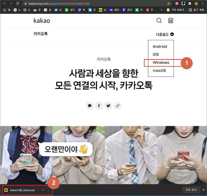 위의 카카오톡 페이지로 이동한 다음 우측 상단의 다운로드 링크를 누르고 팝업 메뉴에서 Windows 버전을 클릭한 다음 KakaoTalk_Setup.exe 파일을 다운로드하여 설치를 진행합니다.
