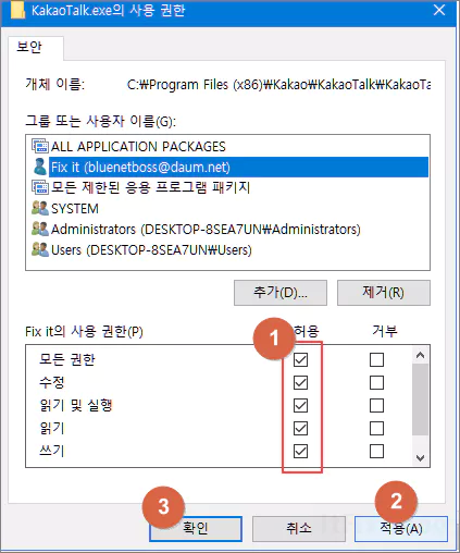 만일, 위의 두가지 과정 모두 문제 해결에 도움이 되지 않았으며 현재 설치되어 있는 상태라면 다음과 같은 직접 권한 부여 방식을 시도해 볼 수 있습니다.