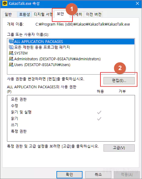 3. 카카오톡 실행 파일에 직접 관리자 권한 재 설정