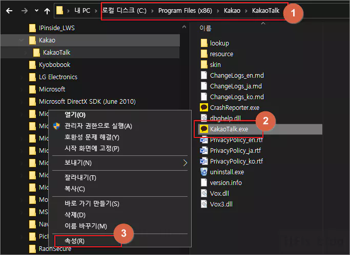 파일 탐색기에서 카카오톡 PC 버전이 설치된 "C:\Program Files (x86)\Kakao\KakaoTalk" 경로로 이동한 다음 카카오톡의 실행 파일인 KakaoTalk.exe 파일을 마우스 우클릭한 후 속성을 선택합니다.