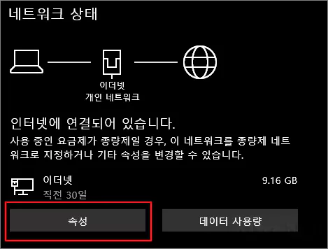 윈도우 설정 > 네트워크 및 인터넷 > 이더넷의 속성 버튼을 클릭합니다.