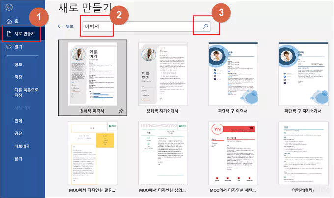 MS 워드를 열고 상단 메뉴에서 파일을 누른 다음 새로 만들기를 클릭하고 검색창에 이력서라고 타이핑한 다음 검색 버튼을 누르면 MS 워드에서 미리 디자인된 많은 종류의 깔끔한 이력서 및 자기소개서 양식들이 열립니다.