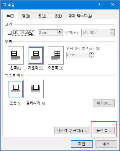 다음으로 표 속성 창이 열리면 우측 하단의 옵션 버튼을 클릭합니다.