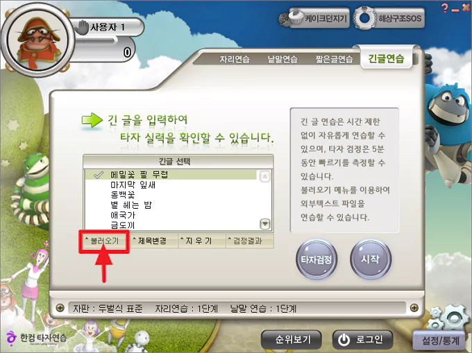 한컴 타자 연습의 긴 글 연습에서 긴 글 등록하는 방법