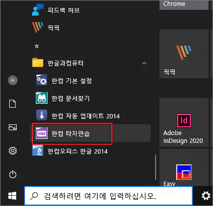 한컴 타자 연습은 윈도우 시작 프로그램 그룹에서 한컴 오피스가 설치된 폴더를 클릭하여 드롭 다운 메뉴에서 실행할 수 있습니다.
