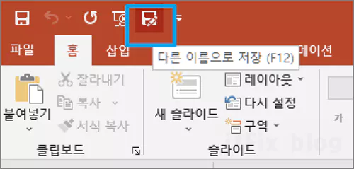 파워포인트의 상단 메뉴에서 파일 > 옵션으로 들어간 다음 빠른 실행 도구 모음에서 다른 이름으로 저장 버튼을 추가해 줍니다.