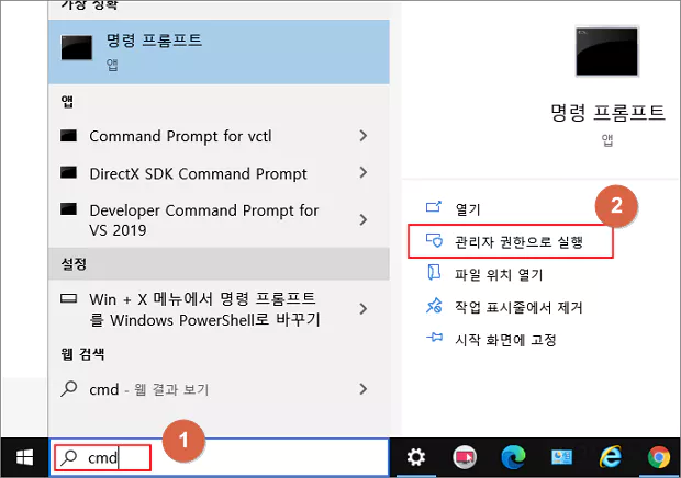 윈도우 작업표시줄의 검색 상자에 CMD라고 입력한 다음 관리자 권한으로 실행합니다.