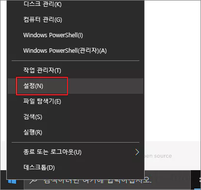 작업 표시줄에 있는 윈도우 시작 로고를 마우스 우클릭한 다음 설정을 누릅니다.