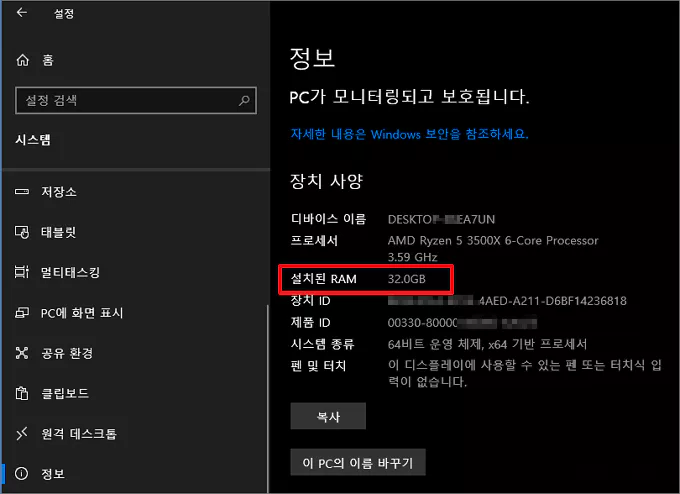 그다음 윈도우 설정 > 시스템 > 정보 순으로 들어가면 오른쪽으로 현재 시스템에 대한 상세한 하드웨어 내역이 나옵니다. 그중에서 설치된 RAM이라는 항목이 해당 컴퓨터에 부착된 물리적인 실제 메모리의 크기를 나타냅니다.