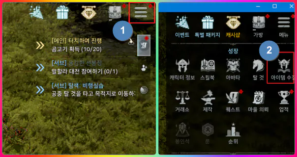 우측 상단을 클릭하면 아이템 수집 아이콘이 보입니다. 아이템 수집 아이콘을 클릭합니다.