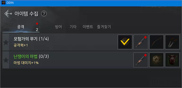 공격 탭을 보니 이미 하나는 모아서 완성했고 나머지 3개를 모으면 되는 '모험가의 무기'라는 항목이 보입니다.