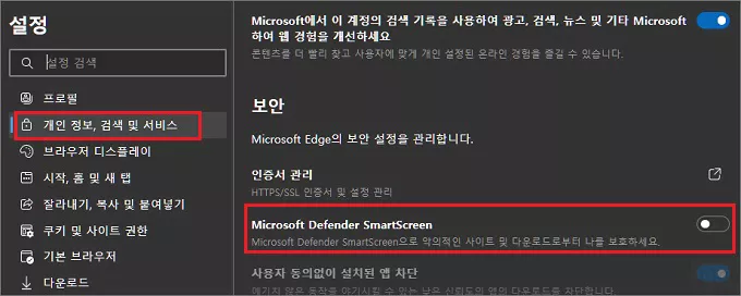 MS 엣지의 경우에는 3점을 누른 다음 설정 > 개인 정보, 검색 및 서비스 > 보안 항목에서 Microsoft Defender SmartScreen 기능이 꺼져 있는지 확인하시면 됩니다.