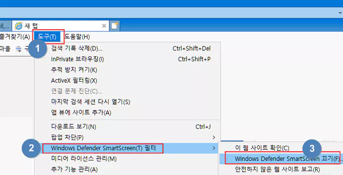 인터넷 익스플로러의 경우에는 상단 메뉴 중 도구 > Windows Defender SmartScreen 필터 > Windows Defender SmartScreen 끄기를 클릭해 주면 됩니다.