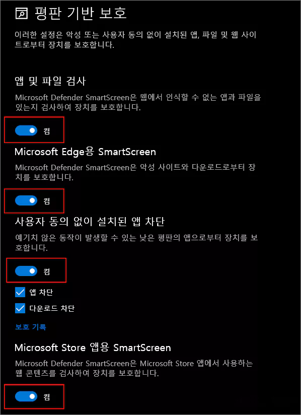 아래의 그림에서 처럼 평판 기반 보호 항목에서 켬으로 기본 설정되어 있는 4개의 항목을 모두 끕니다. 이렇게 하면 SmartScreen 및 평판 보호 기능의 작동이 꺼지게 되지만, 보안 경고가 지속적으로 떠 있을 수는 있습니다.