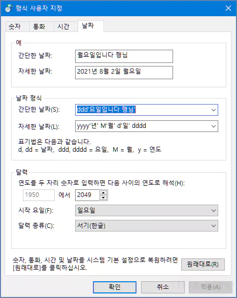 또한, 언제라도 하단에 있는 원래대로 버튼을 누르면 윈도우 기본 표현 형식으로 적용되므로 큰 부담 없이 작업을 진행해 볼 수 있습니다.