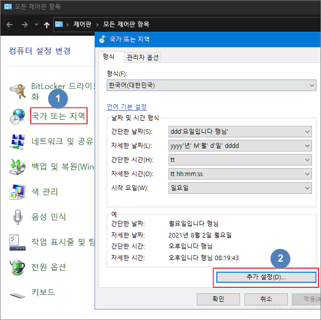 제어판을 열고 보기형식 큰 아이콘으로 보면 국가 또는 지역 항목이 보입니다.