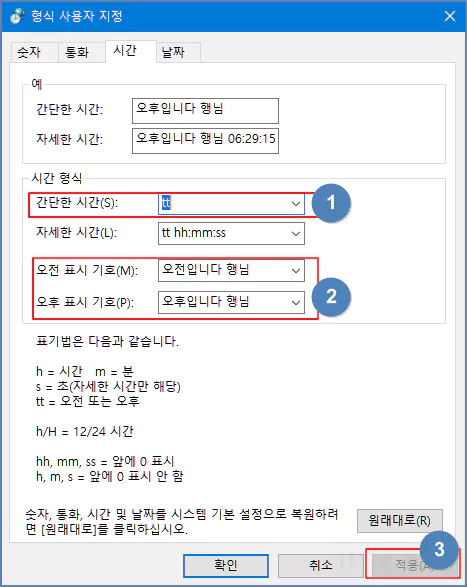 시간 탭에서 아래의 이미지처럼 간단한 시간 칸에는 tt라고 적는 데 이는 오전 또는 오후인지만 표시하라는 것이므로 결국은 그 아래에서 설정하는 오전 표시 기호 및 오후 표시 기호와 중복되므로 오전인지 오후인지만 표시되게 됩니다.