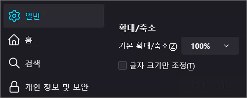 - 파이어 폭스 : 설정 > 일반 > 확대/축소에서 100%로 설정할 수 있으며 파이어 폭스의 경우에는 아래의 이미지에서 처럼 특이하게 글자만 확대 및 축소할 수 있는 세부 옵션을 가지고 있습니다.