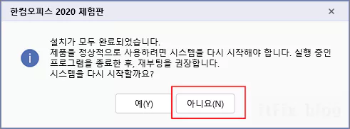 설치는 기본 설치 옵션을 선택해 쭉 진행해 주면 되며, 마지막에 재시작할 지 물어보는 창에서 다시 시작 안 함을 선택해 눌러 줍니다. 그러면 모든 설치 과정은 일단 종료됩니다.