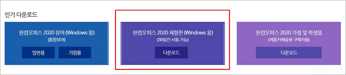 아래의 한글과 컴퓨터 홈페이지로 이동한 다음 한컴 오피스 2020 30일 체험판을 다운로드합니다.