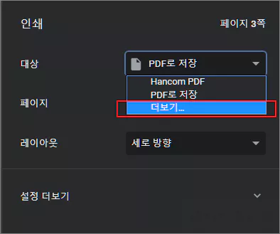 PDF로 저장이 아닌 다른 프린터를 이용한 작업을 해야 할 경우 PDF로 저장 부분을 클릭한 다음 더보기를 클릭합니다.