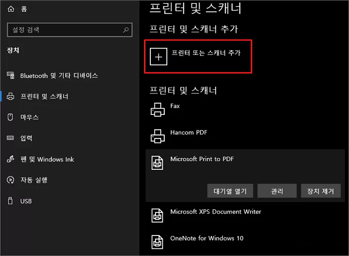 윈도우 설정 > 장치 > 프린터 및 스캐너로 들어간 다음 프린터를 추가하거나 기존의 프린터를 관리 또는 제거할 수 있습니다.