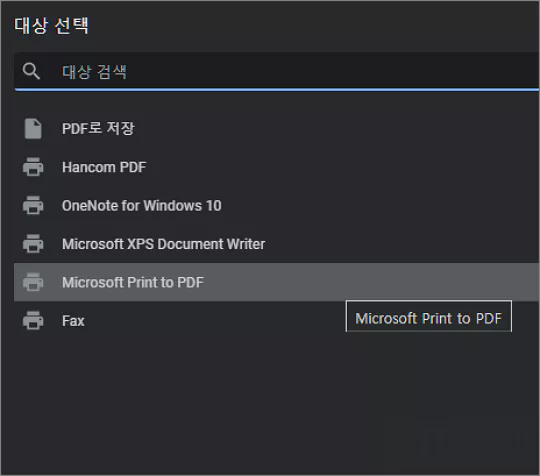 PDF로 저장이 아닌 인쇄를 원한다면 Microsoft Print to PDF를 선택하고, 물리적인 로컬 프린터를 원한다면 목록에서 해당 프린터로 변경해 주면 됩니다.