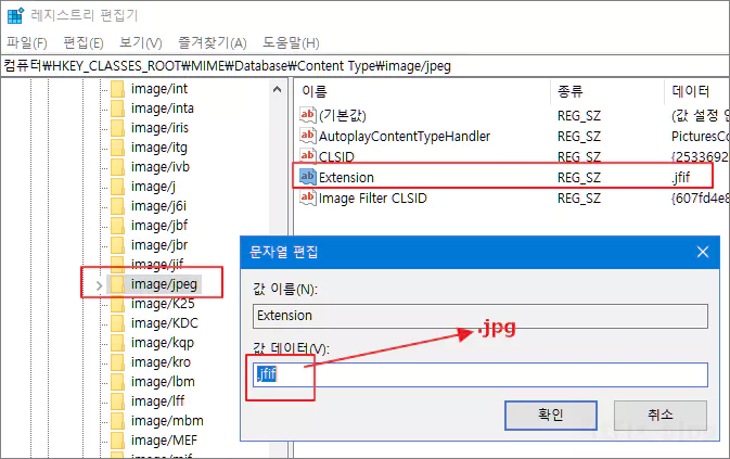 직접 레지스트리 편집기를 수정하여 jpg 계열의 이미지 포맷 방식 중 우선순위를 jfif가 아닌 jpg로 바꿔주면 웹상에서 jpg형태의 파일을 다운로드하는 경우 모두 jpg 형태로 저장되게 됩니다.
