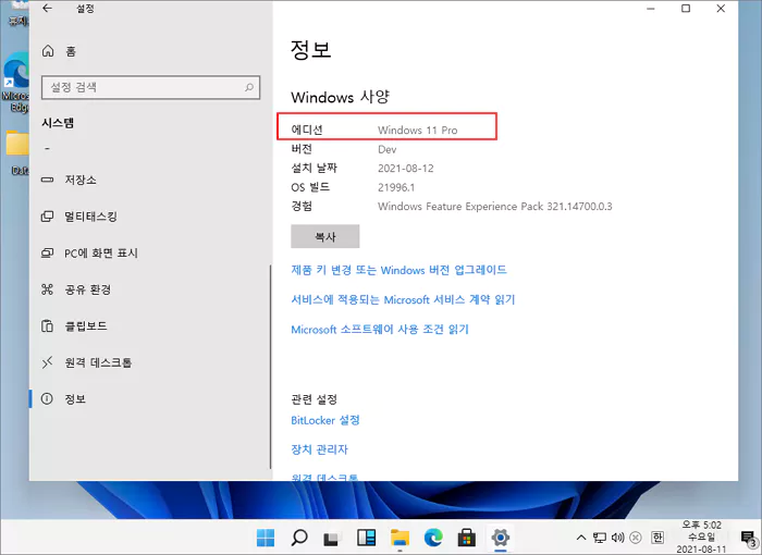 이로써 가상 윈도우인 Vmware 윈도우 10 프로 64비트에서 윈도우 11 프로 64비트로 업그레이드 설치를 완료한 후기를 마칩니다. 아래의 이미지는 설치를 완료한 다음 윈도우 설정의 시스템 정보에서 윈도우 11을 확인한 이미지입니다.