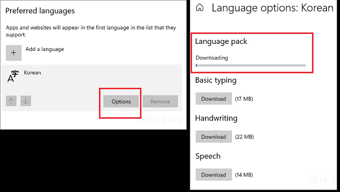 Language 항목으로 이동한 다음 Windows Display Language에서 English(United States)를 클릭한 다음 한국어로 변경해 주면 되는 데, 변경할 수 없는 경우에는 아래쪽에 있는 Korean을 클릭한 다음 옵션을 클릭합니다. 그다음 Korean Language pack을 설치하면 한글 윈도우로 변경됩니다.