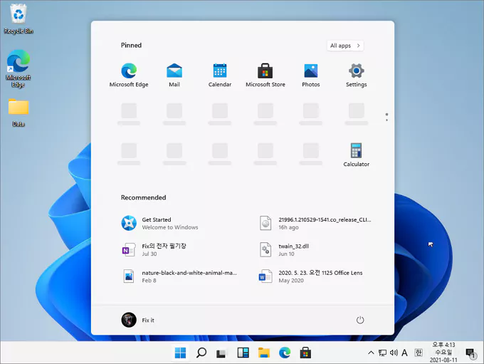 설치 과정이 끝나고 나면 몇 개의 설치 후 설정 과정이 진행됩니다. 이후 모든 과정을 끝마치고 시작된 윈도우 11 영문판 첫 시작 화면은 아래와 같은 모습입니다. 윈도우 시작 버튼이 작업 표시줄의 정 중앙으로 이동한 모습이 가장 먼저 눈에 들어옵니다. 검색 상자는 입력폼을 기본으로 하는 것이 아닌 돋보기 모양의 바로가기 아이콘을 시작 버튼 옆에 배치하는 방법으로 기본 설정한 것도 보입니다.
