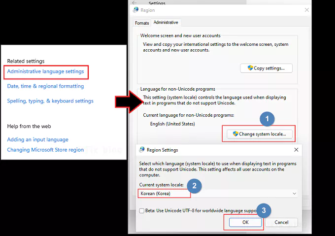 추가적으로 아래의 이미지에서 처럼 언어 설정 페이지 아래쪽으로 있는 시스템 로켈이나 관리 언어 설정 링크를 클릭하여 시스템 로켈을 변경하고 시간 및 날짜 기준 위치도 서울로 변경해 줍니다.