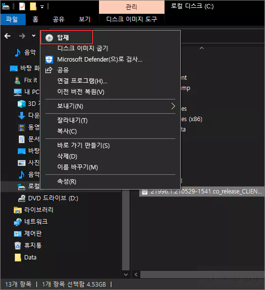 과정이 끝나면 이미지 파일을 우클릭하고 탑재를 클릭하면 파일 탐색기에서 새로운 이미지 드라이브가 생기게 되며 내부의 설치 파일들을 볼 수 있습니다.