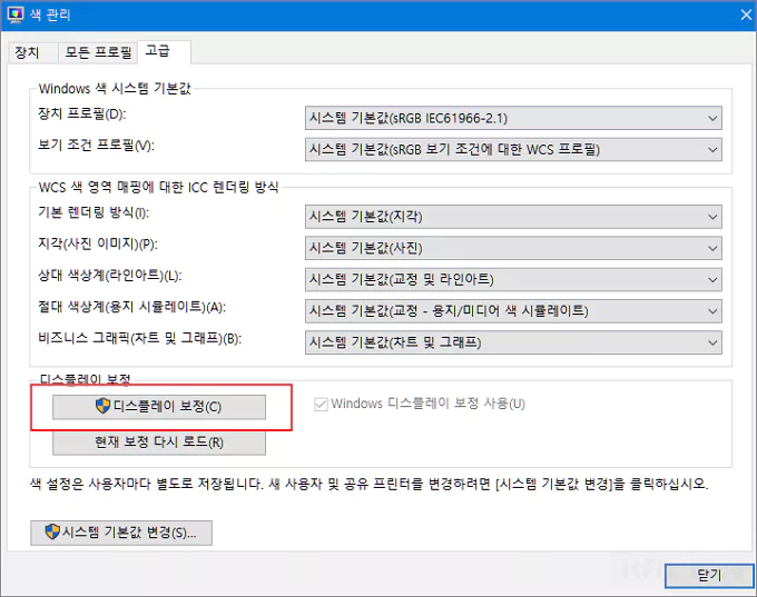 고급 탭의 디스플레이 보정 버튼을 클릭합니다.