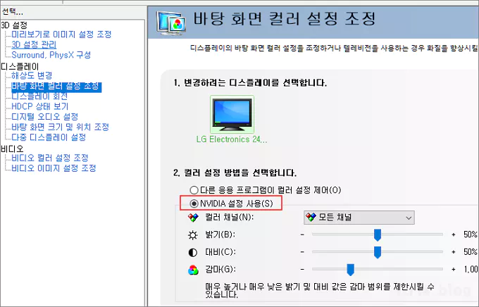 다만, 아래의 이미지에서 보는 바와 같이 윈도우에서 가진 우선권을 Nvidia 설정 사용으로 변경해야 합니다.