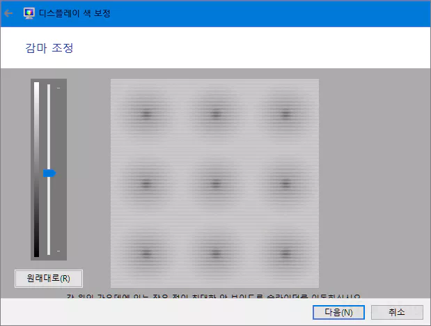 이후에 나타나는 디스플레이 보정 설정 화면에서 감마 설정 및 밝기 등 다양한 보정을 조절할 수 있으며, 이 작업이 끝난 후 폰트 또는 글꼴 등의 선명도 설정과 관계있는 ClearType 설정도 이어서 작업할 수 있습니다.
