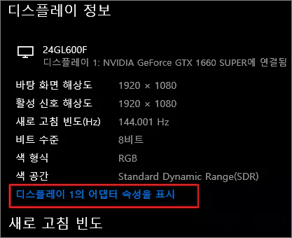 윈도우 설정 > 시스템 > 디스플레이 > 고급 디스플레이 설정 > 어댑터 속성 표시로 진입합니다.